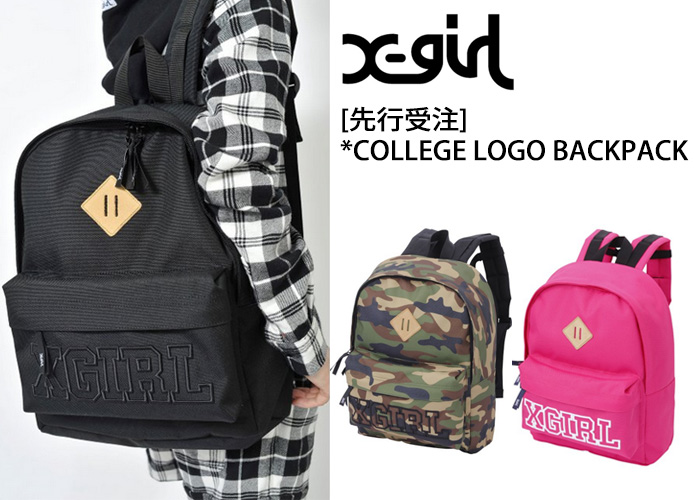 x-girl 先行受注預訂 College Logo Backpack, 有黑色, 粉紅同迷彩選擇加X-girl logo, 10月尾日本發送, 訂購查詢可PM 或致電 28920209.